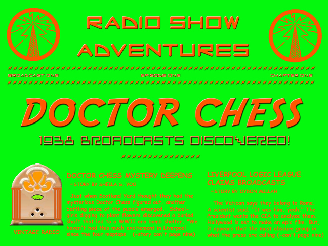 PROGRAM NOTE: The Radio Show Adventures of Doctor Chess, in their original format, may experience the Altered Translation Effect if not re-broadcast with the originally intended equipment. Your computer may transform the program sound with its closest data base references. -THE MYSTERIOUS MENUS COMPANY